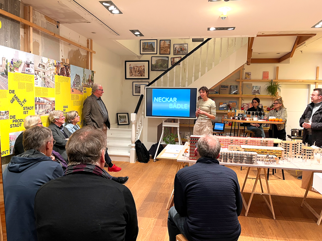 Im Anschluss hatte das charmante IBA’27-Vorhaben Neckarbädle seinen großen Auftritt: Die planende Architektin Marlène Witry (Schürmann Witry Architekten) stellte das ambitionierte Projekt am Neckarufer in Stuttgart-Bad Cannstatt in einer Art Pecha Kucha Präsentation vor. Und auch wenn es Glühwein zu trinken gab, konnten sich danach wohl die meisten Anwesenden gut vorstellen, in Zukunft am Neckar zu baden.